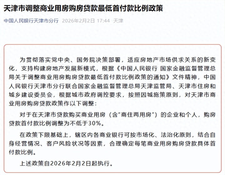 为贯彻落实党中央、国务院决策部署,适应房地产市场供求关系的新变化,支持构建房地产发展新模式,根据《中国人民银行 国家金融监督管理总局关于调整商业用房购房贷款最低首付款比例政策的通知》文件精神,中国人民银行天津市分行联合国家金融监督管理总局天津监管局、天津市住房和城乡建设委员会,根据城市政府调控要求,按照因城施策原则,对天津市商业用房购房贷款政策作以下调整: